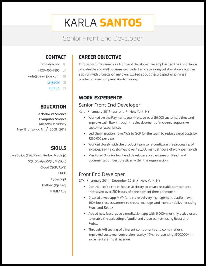 Experience of working with front end developers to design the operating model for user interfaces, with focus on clean, simple usability. A person not afraid of math and statistics. Find out what is the best resume for you in our ultimate resume. Writing functional requirement documents and specifications. Download and customize our resume template to land more interviews. Quantify the bullet points on your resume applying for front end developer positions can be incredibly stressful and demoralizing. Front end developers add the magic to the science. Junior or senior, everyone wants their resume to stand. It shows a sample resume of a web developer which is very well written. Someone who is able to implement design through various. Learn to build a front end developer resume to create a good first impression. Was involved in developing aurelia js components for the front end which included client side logic, view and view model configurations, service consumption and responsive web development. Seasoned and independent front end developer with 5 years of experience in blending the art of design with skill of programming to deliver an immersive and engaging user experience through efficient website.